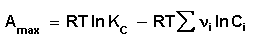 Уравнение изотермы Вант-Гоффа позволяет рассчитать максимальную работу химической реакции и тем самым определить возможность её самопроизвольного протекания в каких-либо конкретных условиях (при температуре Т и концентрациях реагентов Ci или парциальных давлениях Pi). |