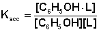 По интенсивности ν(ОH) неассоциированных молекул фенола (п-хлорфенола, крезола, п-нитрофенола и др.) можно рассчитать равновесную концентрацию свободного фенола в условиях следующего химического равновесия (L - органическое основание): C6H5OH + L = C6H5OH···L Так как константа ассоциации: