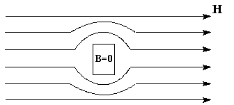 Идеальный диамагнетизм возникает в проводниках, не обладающих электрическим сопротивлением - сверхпроводниках. Механизм его возникновения такой же, как у диамагнетизма. Внешнее магнитное поле индуцирует в проводнике токи, магнитное поле которых противоположно внешнему. Но в случае простых диамагнетиков контур индуцированного тока ограничен размерами атомов или молекул. В сверхпроводниках же эти токи охватывают поверхность всего тела, и поэтому диаметр кольцевых токов на много порядков больше. Экранирующие токи в сверхпроводнике такой величины, что создаваемое ими магнитное поле полностью компенсирует внешнее магнитное поле. Так что внутри сверхпроводящего тела магнитный поток В равен нулю (рис. 4). Иначе говоря, возникает ситуация, при которой образец как бы препятствует проникновению в него магнитного потока внешнего поля.