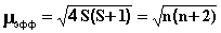 Парамагнетизм связан обычно с наличием неспаренных электронов в атоме или молекуле. Некоторые молекулы, такие как NO, NO2, ClO2 парамагнитны, так как у них имеется нечётное число электронов. Молекулы подобного типа склонны к димеризации, при этом димеры уже не имеют неспаренных электронов и поэтому диамагнитны, например N2O4. Органические свободные радикалы также содержат неспаренные электроны и потому парамагнитны, а продукты их рекомбинации являются диамагнетиками, поскольку не содержат неспаренных электронов. Несколько иная причина парамагнетизма молекул О2 и S2. В этих молекулах верхняя занятая орбиталь дважды вырождена, и на таком дважды вырожденном уровне находятся два электрона. Поэтому, в соответствие с правилом максимальной мультиплетности Хунда, на каждой из вырожденных орбиталей должен находиться один неспаренный электрон. Таким образом, молекулы О2 и S2 и им подобные имеют по два неспаренных электрона и обладают значительным парамагнетизмом. Большой интерес представляет парамагнетизм, возникающий при наличии частично заполненных электронных оболочек у атомов и ионов переходных и редкоземельных металлов и актиноидов. Неспаренный электрон в таких системах имеет как спиновый, так и орбитальный угловой момент. Сочетание этих двух факторов приводит к возникновению магнитного момента, а, следовательно, и парамагнетизма. Поведение неспаренных электронов в атоме или молекуле, ответственных за парамагнетизм, зависит от многих факторов, как внутренних (особенности строения атома, лигандное окружение центрального иона, обменное взаимодействие между парамагнитными частицами и т.п.), так и внешних (магнитное поле, температура и др.). Если известен энергетический спектр рассматриваемой системы, то магнитную восприимчивость и её температурную зависимость можно рассчитать, используя уравнение Ван Флека [3-4]. Такие расчёты показали, что величина μэфф действительно включает в себя спиновую и орбитальную составляющие. Для атомов или ионов, имеющих наполовину заполненную оболочку (d5 или f7) орбитальная составляющая отсутствует, и магнитный момент определяется только спиновой составляющей. В некоторых случаях (3d-элементы) орбитальная составляющая в значительной степени подавлена полем лигандов и поэтому магнитный момент также близок к чисто спиновой величине. Для таких систем величина эффективно магнитного момента (в магнетонах Бора) определяется полным спином атома (иона) S или числом неспаренных электронов n (14):