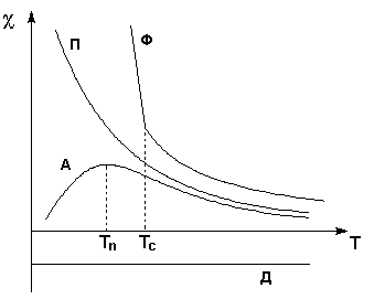 Как видно из соотношения (17), идеальный диамагнетик имеет магнитную восприимчивость практически в миллион раз большую, чем обычный диамагнетик. Долгое время наблюдать свойства идеального диамагнетика и повторить эффект Мейсснера можно было лишь при сверхнизких температурах (область гелиевых температур). Однако с 1986 г. это можно сделать и в лабораториях, работающих с температурами жидкого азота, поскольку появились высокотемпературные проводники керамического типа. Температуры фазовых переходов некоторых из них уже достигают 100 К и даже более. В 1989 г. мы наблюдали свойства идеального диамагнетика и в нашей лаборатории. В заключение раздела, посвящённого свойствам магнетиков различного типа, следует отметить, что экспериментально идентифицировать магнетики бывает трудно. Однако, используя сведения о знаке и величине магнитной восприимчивости, её зависимости от напряжённости магнитного поля и температуры (рис. 5), эту задачу можно успешно решать. Рис. 5. Зависимость магнитной восприимчивости от температуры.